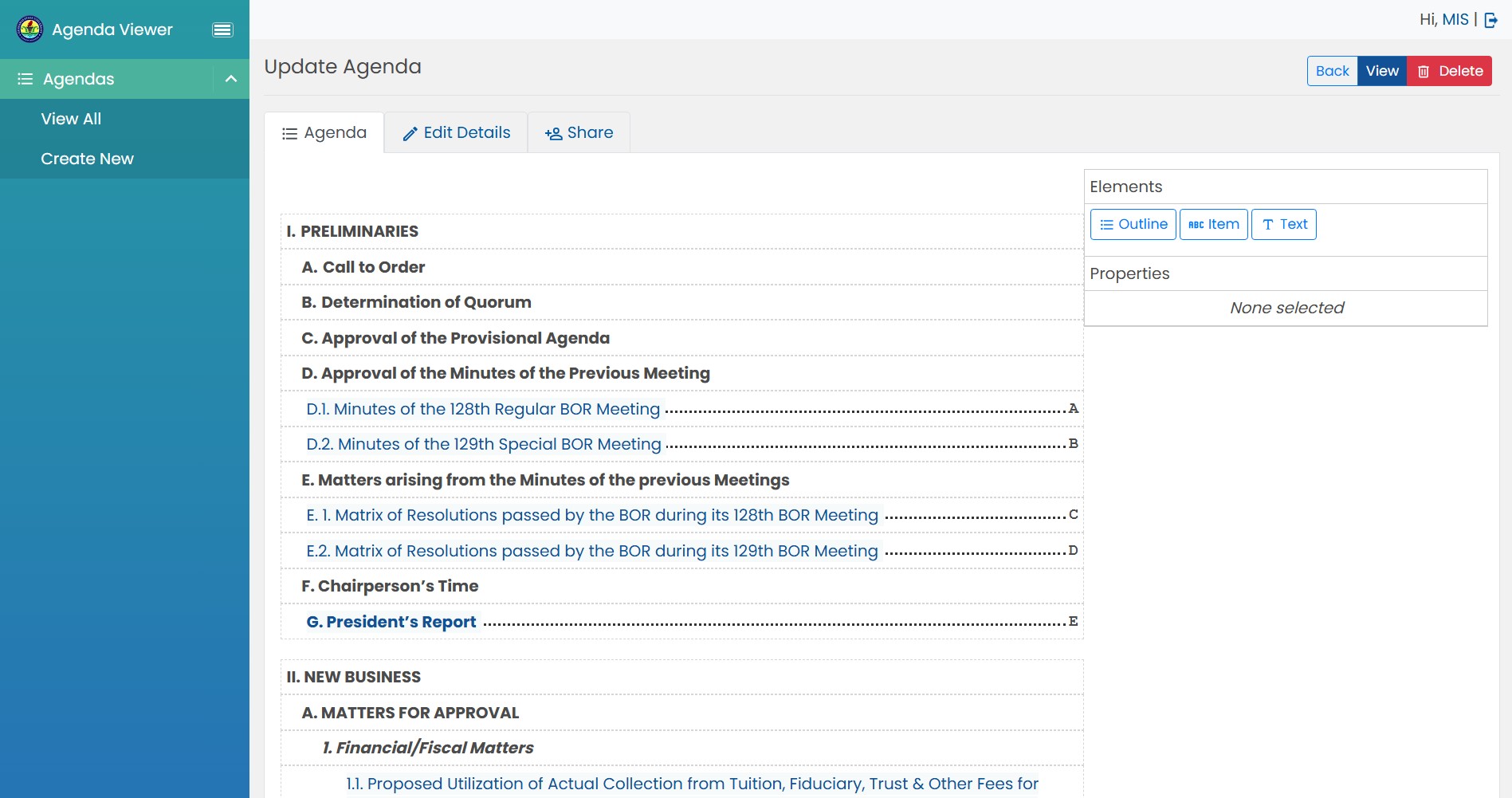 Description: A secure online platform for creating, managing, and presenting Board of Regents meeting agendas, enabling controlled digital access to agenda documents and supporting paperless governance processes.