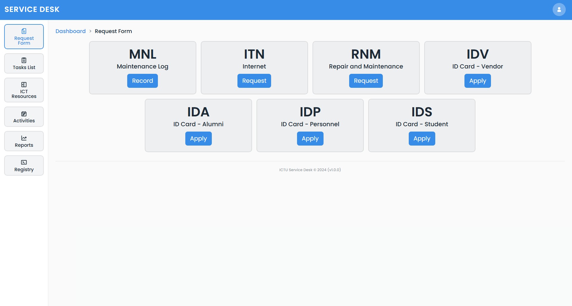 Description: A centralized online system for managing ICTU service requests, asset-related records, and operational logs for students and university personnel.